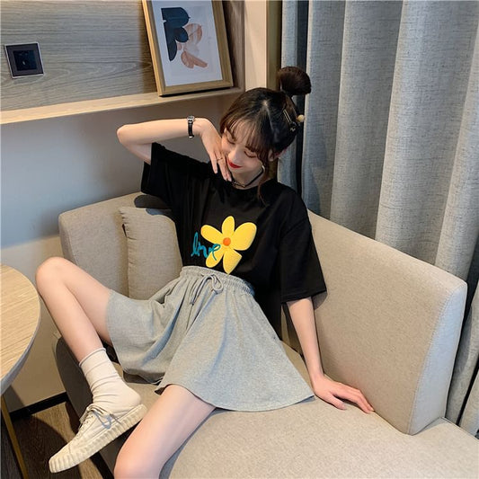 Short-Sleeve Square Faux Button Neck Knit Pearl Plain Drawstring Top