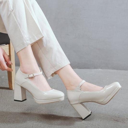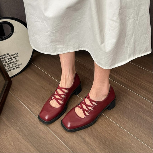 Chunky Mary Lace-Up Pumps Heel Jane Square Toe Plain