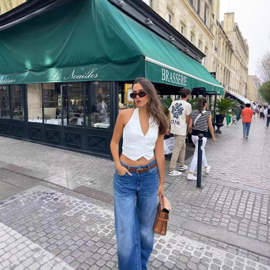 Halter Flower Back Plain Open Crop V-Neck Vest Single-Breasted Accent