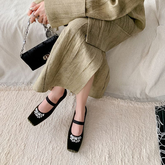 Low Heel Square Toe Rhinestone Velvet Pumps