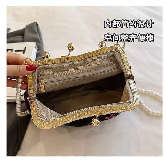 Faux Pearl Strap Kiss Lock Floral Embroidered Tassel Crossbody Bag