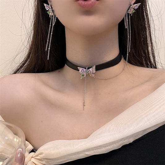 Choker Alloy / Faux Butterfly Threader Leather Earring