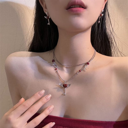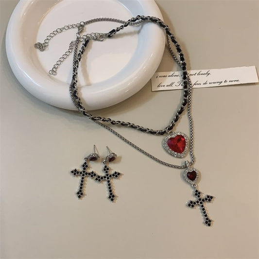 Cross Heart Rhinestone Pendant Layered Alloy Choker / Cross Drop Earring