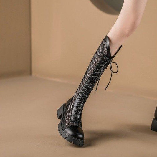 Heel Mesh Lace-Up Chunky Platform Panel Tall Boots