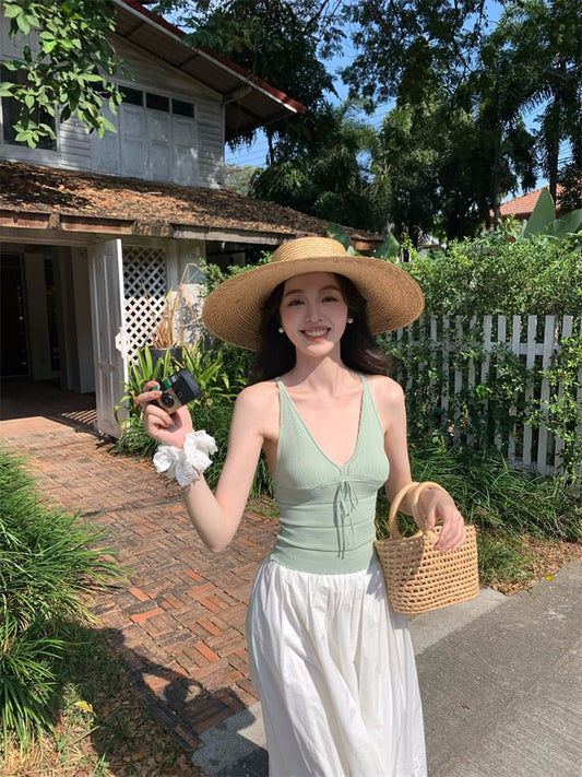 Strap Neck Spaghetti Tie Camisole Plain Top V-Neck