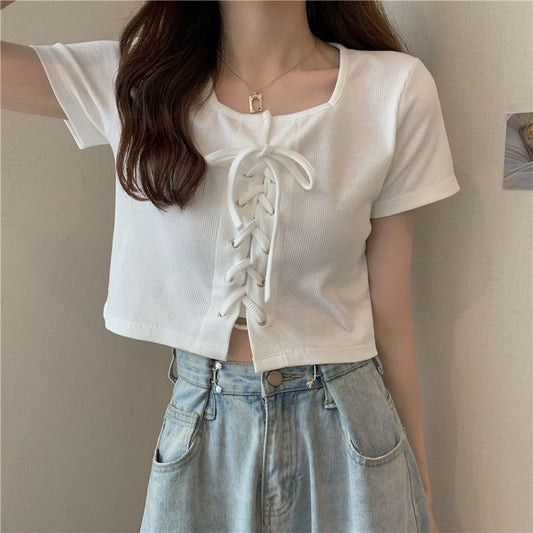 V-Neck Asymmetrical Short-Sleeve Strappy Plain Tee