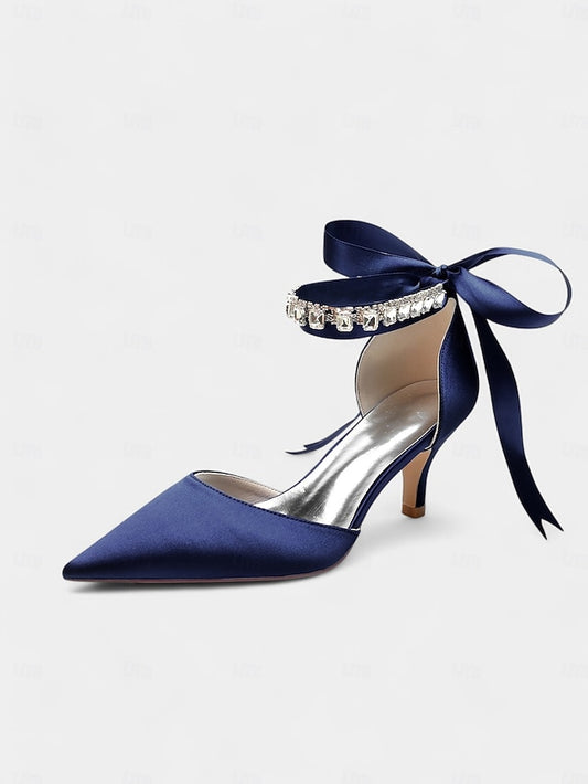 with Ankle and Strap Heels Satin Pointed-Kitten Blue Rhinestone