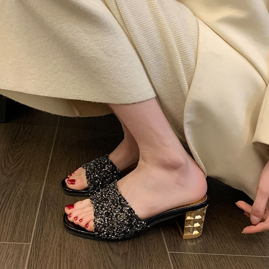 Chunky Rhinestone Sandals Slide Heel