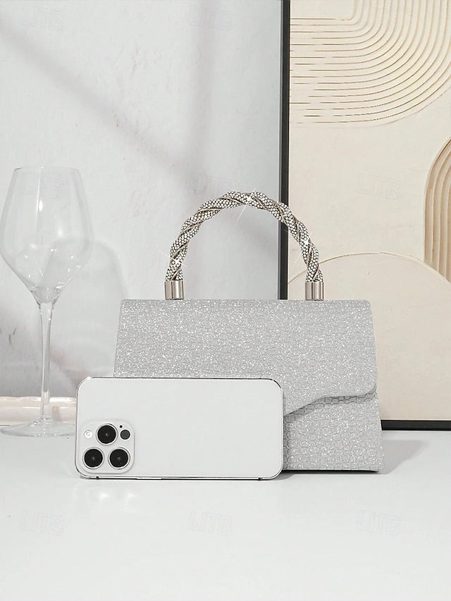 Women's Silver Glitter Handbag with Rhinestone Handle –