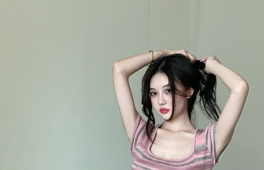 Square-Neck Mini Striped Dress Slim-Fit Short-Sleeve