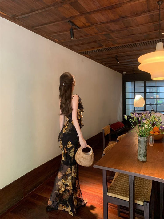 Print Spaghetti Dress Strap V-Neck Floral Maxi