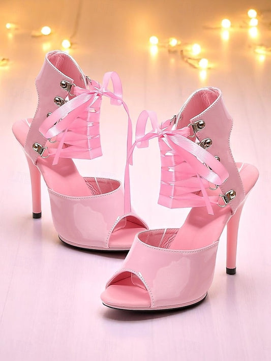 Sexy Stiletto Black - Patent Lace-Up Cutout Women's Sandals